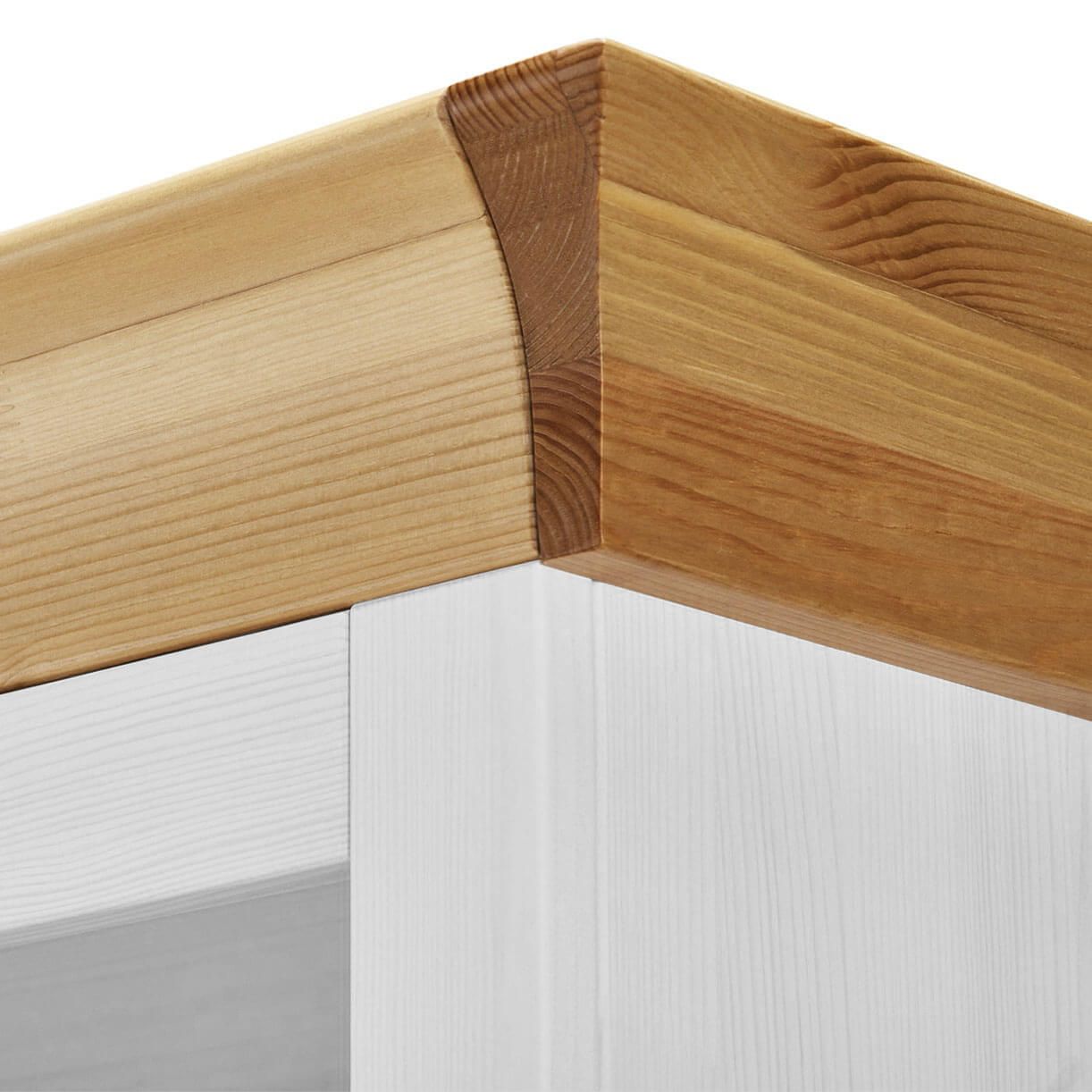 - Выполнен из массива сосны — прочного, экологически чистого, тёплого на ощупь дерева